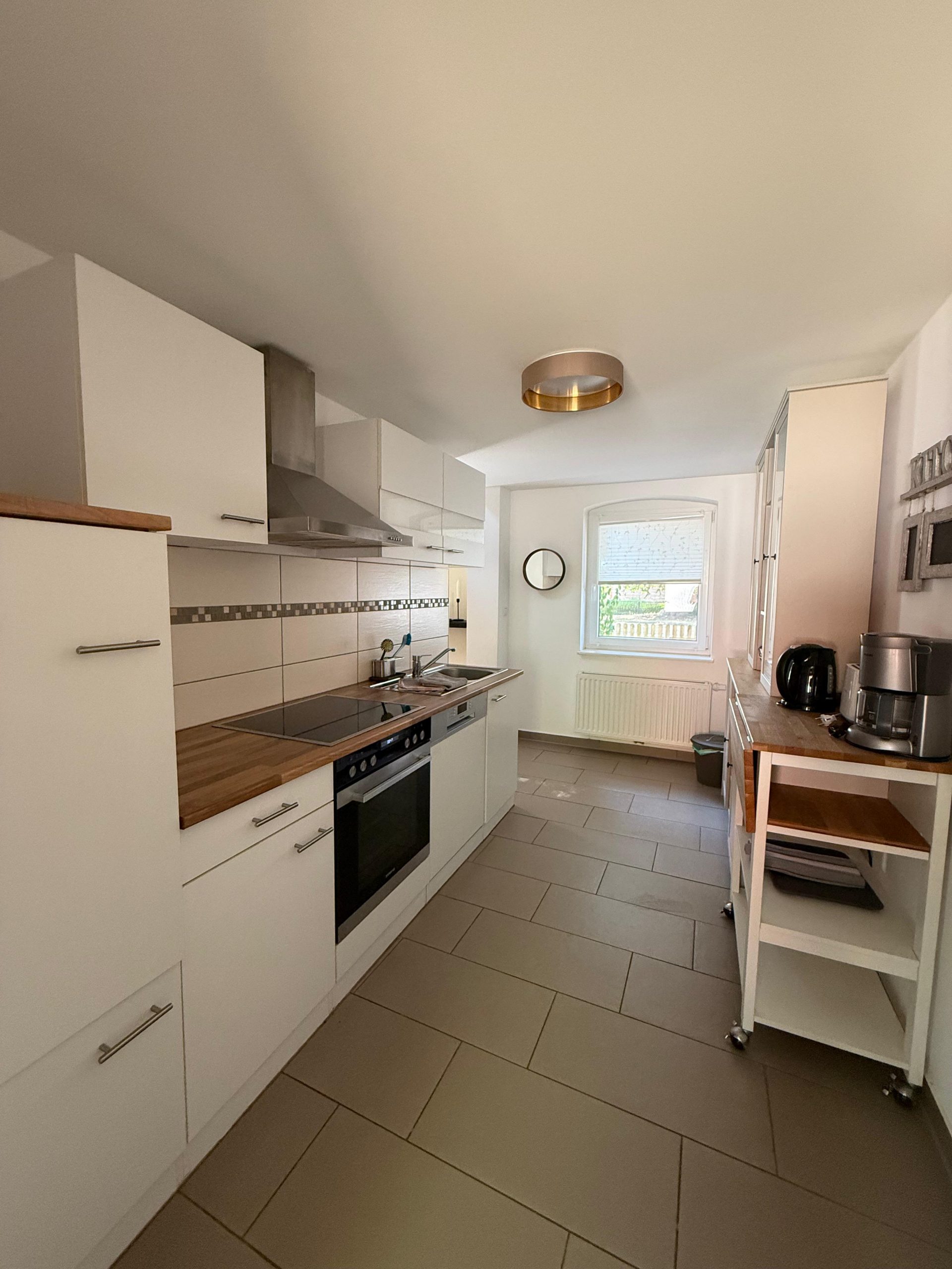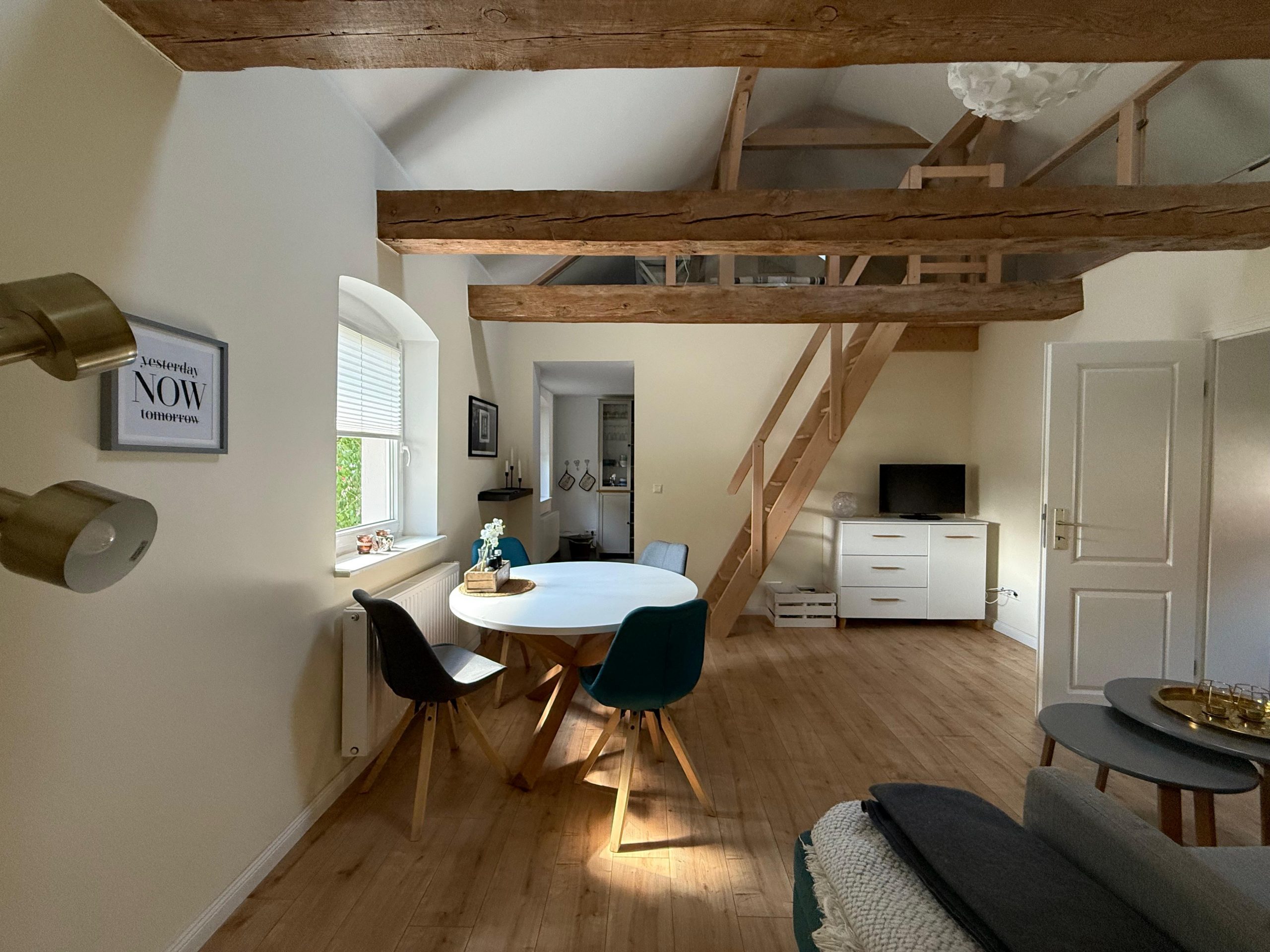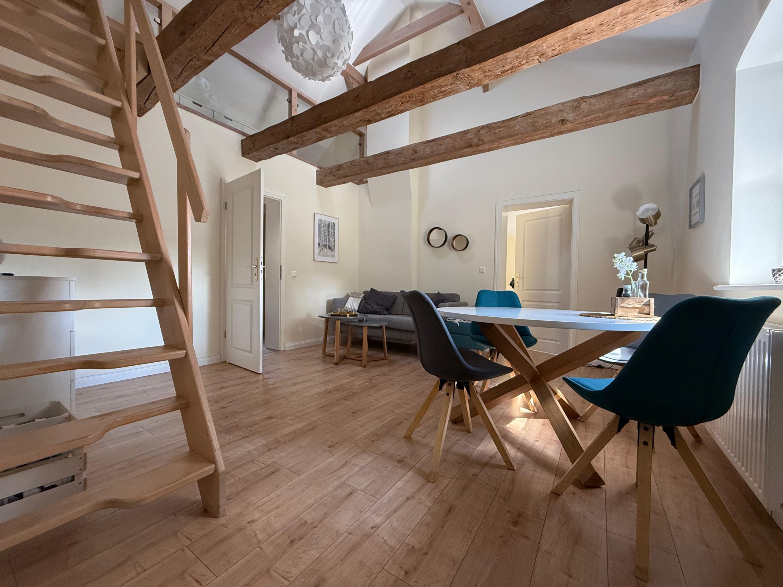 Die Wohnung liegt im Erdgeschoss und bietet Platz für bis zu vier Personen. Auf rund 95 m² Wohnfläche stehen ein gemütlicher Wohn- und Essbereich, eine gut ausgestattete Küche, ein Schlafzimmer sowie ein Badezimmer mit Dusche zur Verfügung. Zusätzlich gibt es eine Schlafempore, sodass Familien oder kleine Gruppen bequem übernachten können. WLAN, Fernseher und eine Spülmaschine gehören ebenfalls zur Ausstattung.